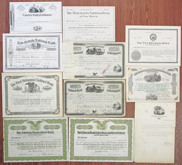 CT.... 1899-1949. Lot of 11 stock certificates from Connecticut banks, highlights include: National Bank of Commerce of New London U/U Capital Stock Certificate; Merchants National Bank of New Haven 16 Shares I/U Capital Stock Certificate; New Britain National Bank 22 Shares I/C Capital Stock Certificate; and Connecticut National Bank of Bridgeport 8 Shares I/C Capital Stock Certificate. All are in Fine condition. (11)