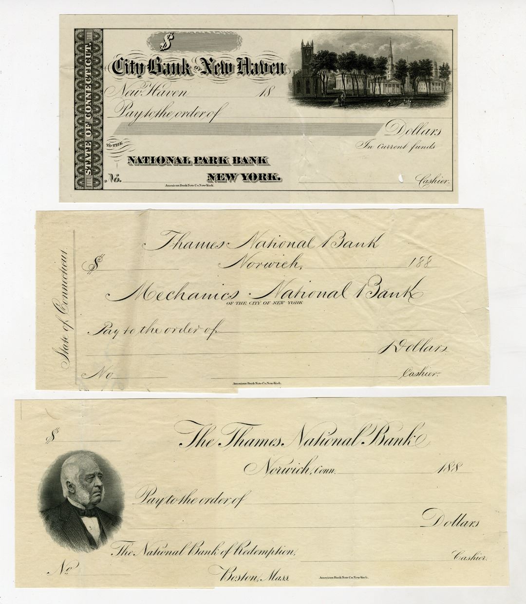 Connecticut, ND (1860-80s). Lot of 3 proof checks printed on india paper or regular paper, Includes: New Haven, City Bank of New Haven, with view of Yale University, appears uncirculated but it has an archivally repaired tear at the bottom middle; and, 2 different Norwich, CT., Thames National Bank in two different styles, one with a portrait of a distinguished gentleman. ABNC. (3). Sold "AS IS" no returns accepted.
