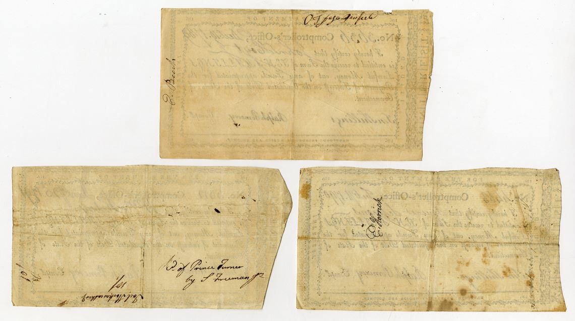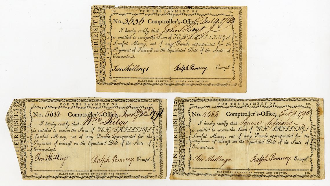 Hartford, Connecticut, 1789, 1790, and 1791. Lot of 3, I/C Promissory Notes all issued to different men all for 10 Shillings and signed by Ralph Pomeroy - Comptroller, Certificates have black print with simple black scroll work border, Ranging from Fine to VF+ condition with minor staining, Cut cancelled at center. Ralph Pomeroy was a notable figure in the late 18th century, serving as the Comptroller of Connecticut in 1790. His career began with significant military service during the American Revolutionary War, where he held positions such as first lieutenant and Deputy Quartermaster General for Connecticut. Following the war, Pomeroy engaged in mercantile and manufacturing activities in Hartford. Despite his attempts to secure federal appointments, including requests to George Washington, he remained active in state roles, notably managing Connecticut's finances as Comptroller, where he oversaw state debt payments and other fiscal responsibilities_. Printed by Hudson and Goodwin. (3). Sold "AS IS" no returns accepted.