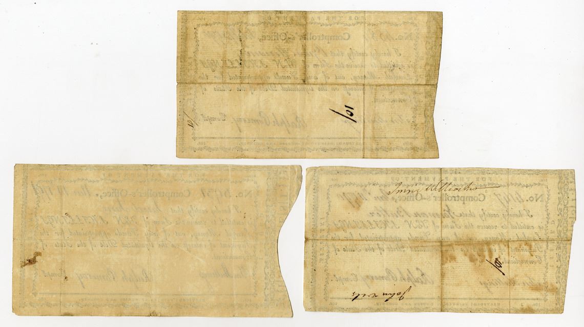 Hartford, Connecticut, 1790-91. Lot of 3, all are I/C payments of "Lawful Money, out of any Funds appropriated for the Payment of interest on the liquidated Debt of the State of Connecticut." All were issued for 10 Shillings, Black text with simple black scroll work border, cut cancelled at center, and signed by Ralph Pomeroy as Comptroller, All are in Fine to VF+ condition. Ralph Pomeroy was a notable figure in the late 18th century, serving as the Comptroller of Connecticut in 1790. His career began with significant military service during the American Revolutionary War, where he held positions such as first lieutenant and Deputy Quartermaster General for Connecticut. Following the war, Pomeroy engaged in mercantile and manufacturing activities in Hartford. Despite his attempts to secure federal appointments, including requests to George Washington, he remained active in state roles, notably managing Connecticut's finances as Comptroller, where he oversaw state debt payments and other fiscal responsibilities_. Printed by Hudson and Goodwin. (3). Sold "AS IS" no returns accepted.