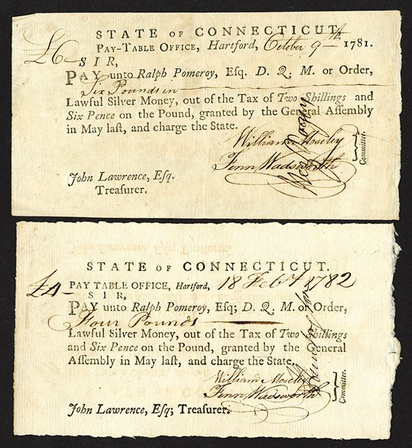 Connecticut. Two different pay table office forms. Nice Very Fine or better. 2 pieces.