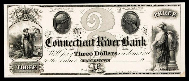 Connecticut River Bank ca.1830's Obsolete Proof.Charlestown, New Hampshire, 18xx (ca.1830's), $3, Plate A, NH-15-G48, Unlisted in census, Proof banknote, black on india paper on thin white card, Standing Liberty on right, male reaper on left with cameo Roman soldier profiles flanking large underprint numeral 3 in middle, Choice Uncirculated condition, Rawdon, Wright, Hatch & Co. Boston imprint. Known in proof only. (Silver City Collection, Part 1)