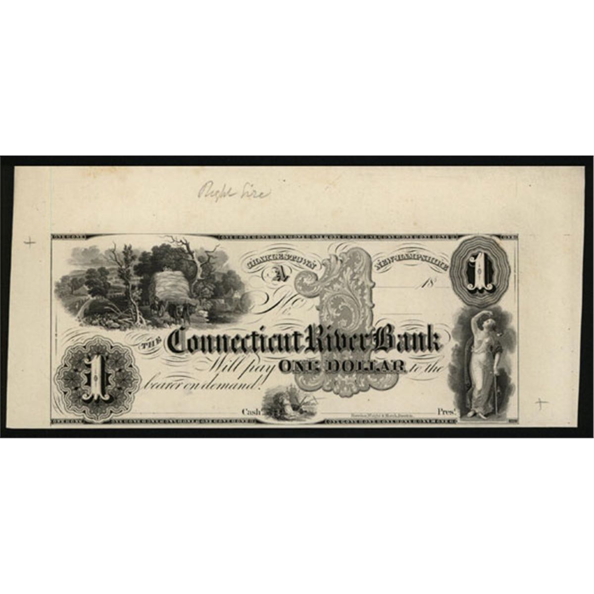 Charlestown, New Hampshire, 18xx (ca.1830's), $1, Plate A, NH-15-G16, Unlisted in census, Proof banknote, black on india paper on thin white card, Oxen pulling load of hay with children on top, underprint numeral 1 in middle, Standing Justice on lower right, Choice to Gem Uncirculated condition with 3 jumbo margin on top and sides and bottom large, Rawdon, Wright, Hatch & Co. Boston imprint. Known as proof only. (Silver City Collection, Part 1)
