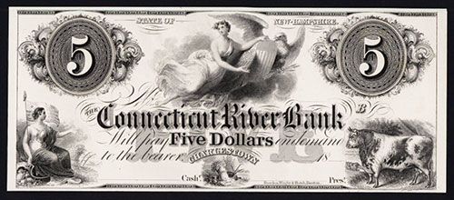 Charlestown, New Hampshire, 18xx (ca.1830's), $5, Plate B, NH-15-G60, Unlisted in census, Proof banknote, black on india paper on thin white card, Seated Liberty with flag on lower left, bull on lower right, wheat and plow on bottom and patriotic eagle and shield flying with topless allegorical woman, large underprint FIVE in middle, Choice to Gem Uncirculated condition, Rawdon, Wright, Hatch & Co. Boston imprint. Unlisted as proof. (Silver City Collection, Part 2)