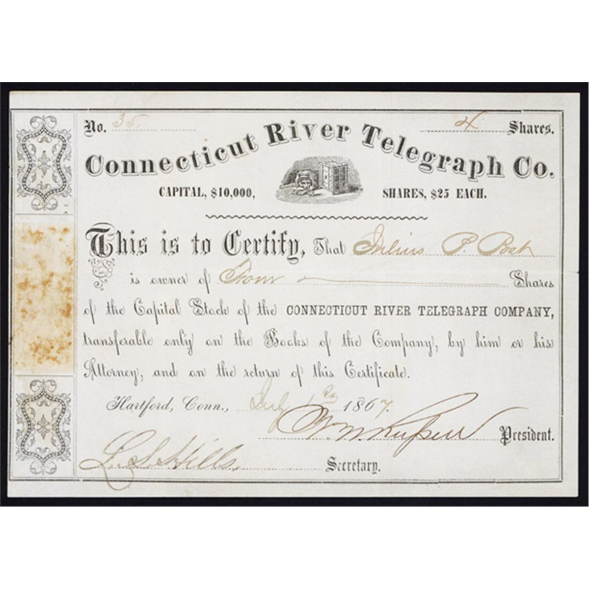 Connecticut, Hartford, 1867, Dog with safe under curved title, Light stains in left end panel due to revenue stamp falling off, otherwise VF. Rare and early telegraph company.