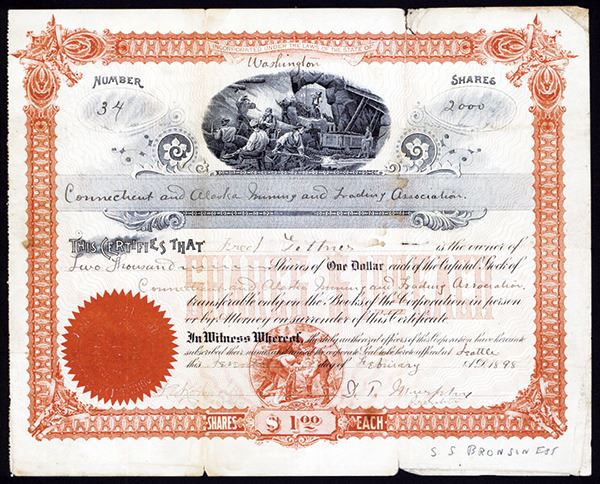 Alaska, 1898. 2000 Shares. Issued and uncancelled stock. Orange-brown border. Miners working vignette. Hand written certificate, Fine condition with handling, toning and very slight water stains. Goes style certificate. Cert. #34.