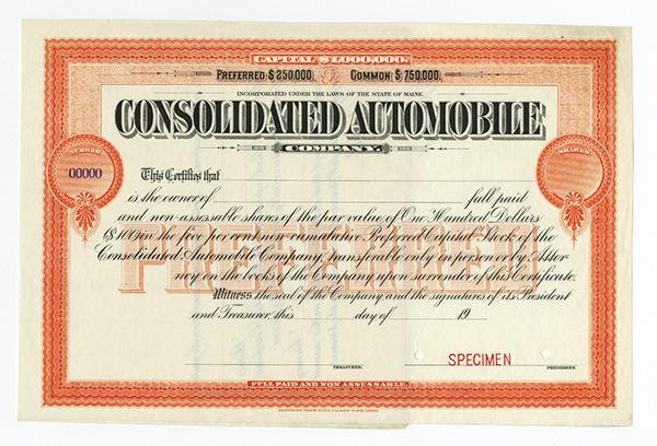 Maine. Odd Shares Preferred Stock Specimen Certificate. Black print with an orange border and under print. No vignette on certificate, company name at top of certificate. Specimen overprint, POC's, XF condition. ABNC.