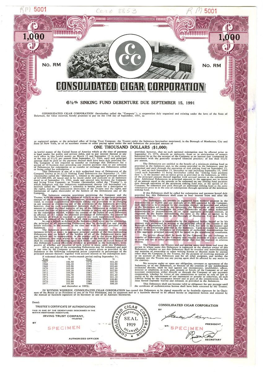 Delaware, ND (1950-60s). $1000 Registered 6 1/2% Specimen Sinking Fund Debenture, Black with maroon border and underprint, Tobacco plants at top, Specimen overprints and POCs, XF to AU condition, S-CBNC.