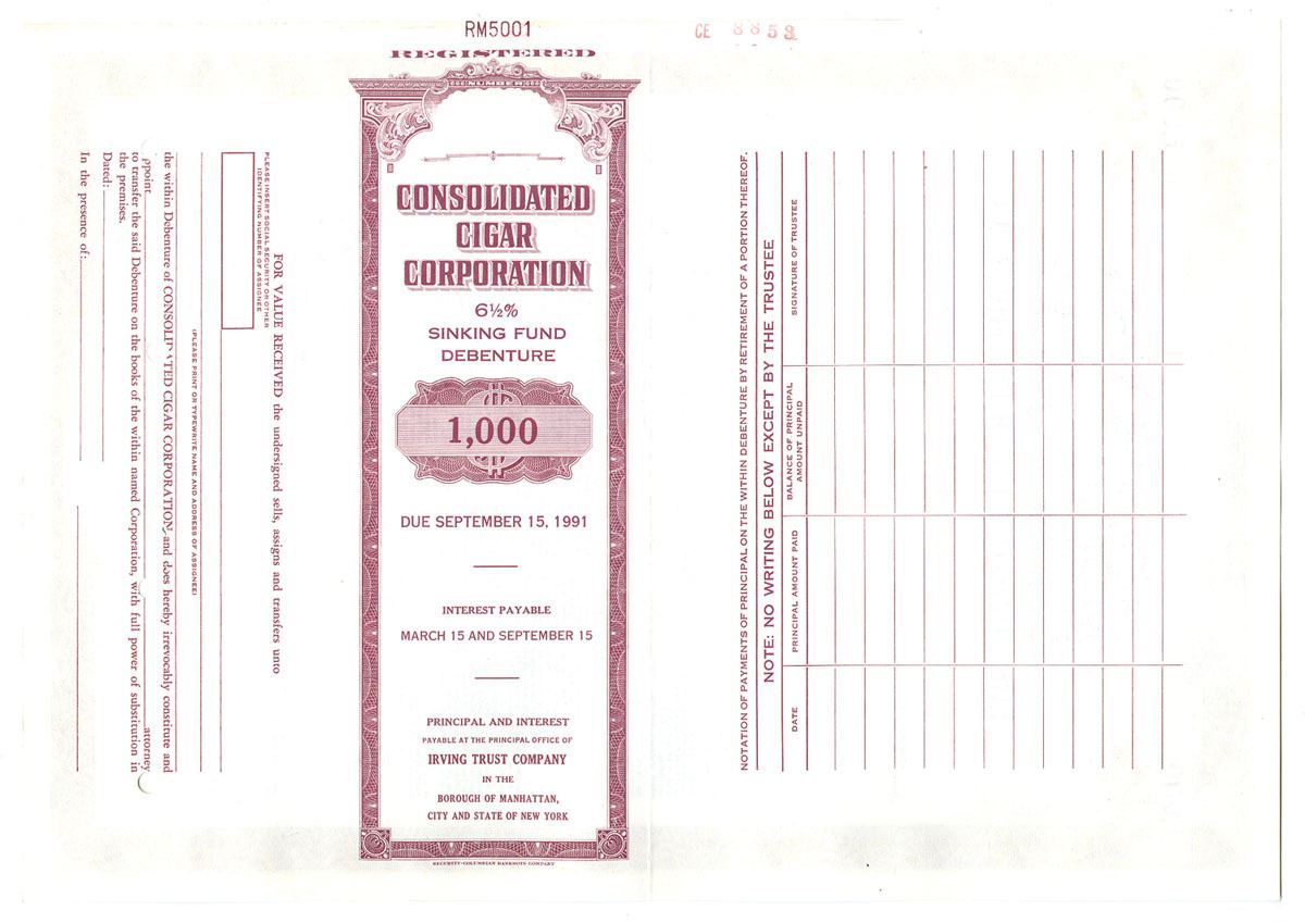 Delaware, ND (1950-60s). $1000 Registered 6 1/2% Specimen Sinking Fund Debenture, Black with maroon border and underprint, Tobacco plants at top, Specimen overprints and POCs, XF to AU condition, S-CBNC.