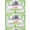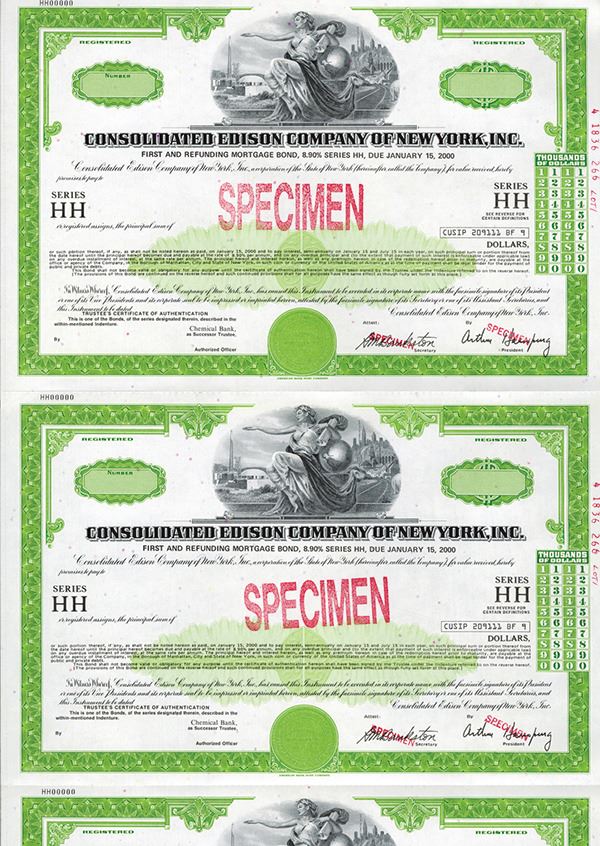 New York, 1981, $-Odd, uncut strip of 5 bonds connected by rouletted paper, Black on lime green, Allegorical woman in middle, New condition. Large red SPECIMEN in middle of each certificate. ABNC.