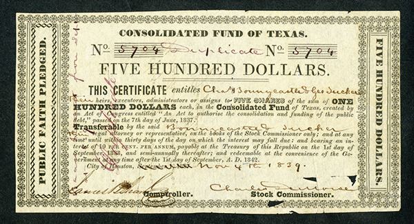 Houston, Texas. 500 Dollars, S/N 5704, issued in Houston, signed by Controller and Stock Commissioner, Very Fine to XF condition apart from cut cancellations at Signature blocks.