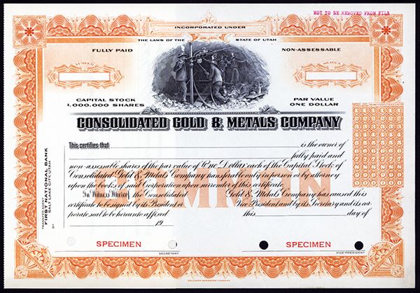 Utah, 19xx (ca.1910-20), Odd Shs, Specimen stock, Black on orange underprint and borders, miners working, POC's, XF condition. Rare certificate with only 2 found in archives.