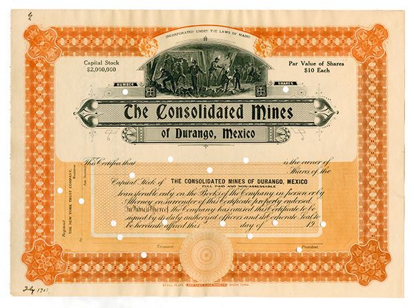 Durango, Mexico (Inc. in Maine), Specimen Odd Shares, Stock certificate, black on orange border and underprint, Miners at top, POC's, Dated July 1907 on the lower left corner. VF to XF condition. From a 1907 Hamilton BNC Sample book. HBNC. Rare and first time seen by the cataloger.