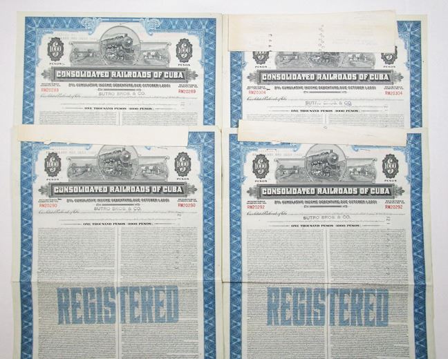 Cuba...., 1959. Lot of 4, $1000 I/U 3% Registered Cumulative Income Debenture Bonds (4), Black on blue border and underprint, Locomotive at top flanked Oxen pulling sugar cane and mules hauling tobacco, All are in VF-XF condition with minor wear, SBNC. (4). Sold "AS IS" no returns accepted.