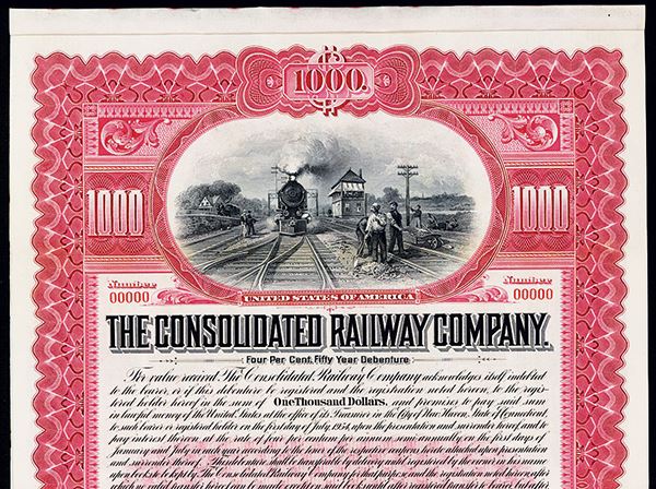 New Haven, Connecticut, 1904, $1000, Specimen 4% Gold Bond, Red Border, track workers with train coming head on, Coupons Attached, POC, XF. Unlisted railroad in Cox. ABNC.