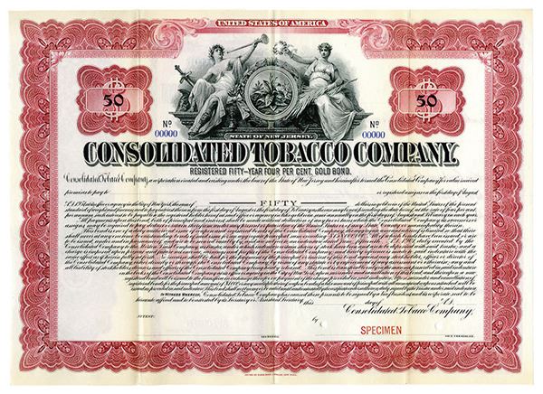 New Jersey, 1901. $50 Specimen 4% Registered Gold Bond, Black text with red border and underprint, Allegorical figures flank tobacco plant at top center. Red specimen overprints, 00000 serial numbers, and POCs. Fine-VF condition, ABNC. The Consolidated Tobacco Company was formed in 1901 to take over the common stock of the American and Continental Tobacco Companies.