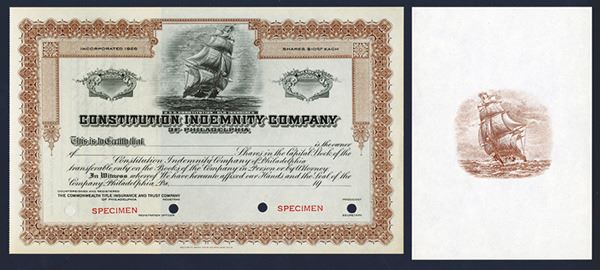 Pennsylvania. -Odd Shrs Stock Certificate Specimen. Security BNC. With revered image of vignette of U.S.S. Constitution as used on the certificate (with the slightest modification in the banner at top mast). Very Fine +. 2 pieces.