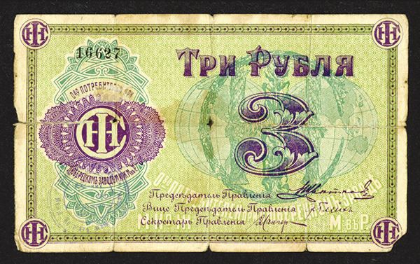Luberts, Russia, 3 Rubles, VG with reinforced splits, missing lower right corner, strong folds and small hole in middle, still rare and attractive private note. (The Pogrebetsky Family Archives)