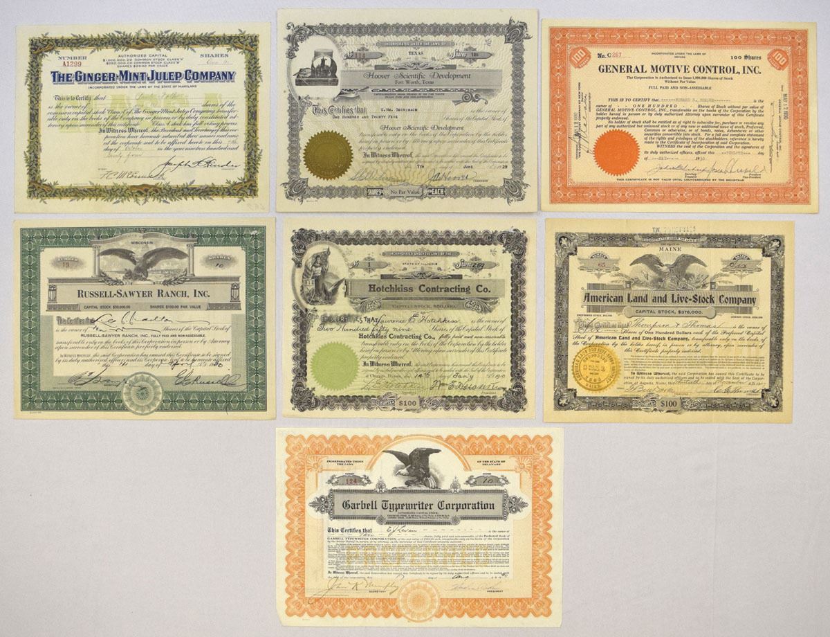 Various States...., 1907-30. Lot of 7 I/U Stock Certificates, Includes: Ginger-Mint Julep Co.; Honor Scientific Development; General Motive Control Inc.; Garbell Typewriter Corp.; Hotchkiss Contracting Co.; Russell-Sawyer Ranch Inc.; and American Land and Live-Stock Co. Conditions range from VF to XF. (7). Sold ‘AS IS’ no returns accepted.