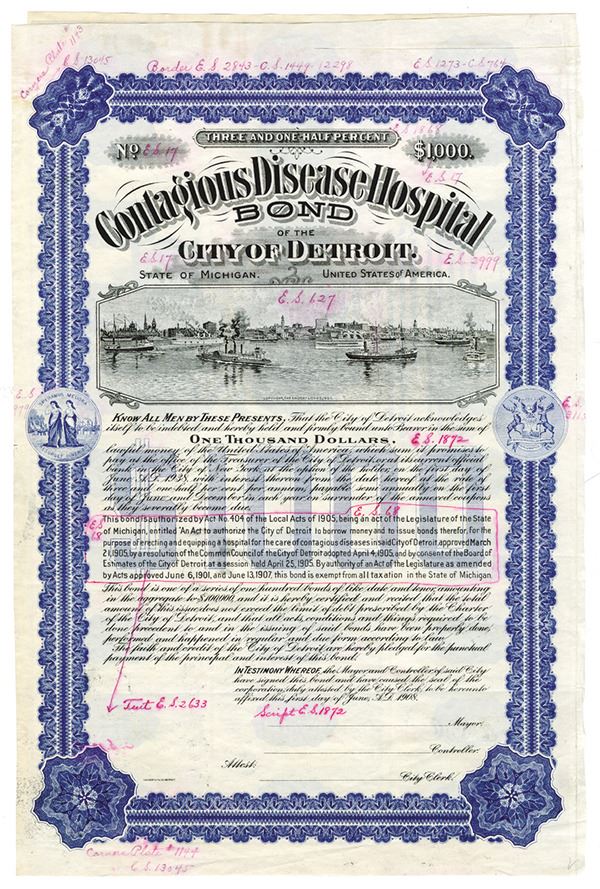 Michigan. $1000 Proof 3 1/2% Coupon Bond, Black print on blue border and under tint, Company title at top with image of boats out on Lake Michigan below, Notes made in margins with bright pink pen regarding specifications of certificate, VF-XF condition, Calvert Lith Co.