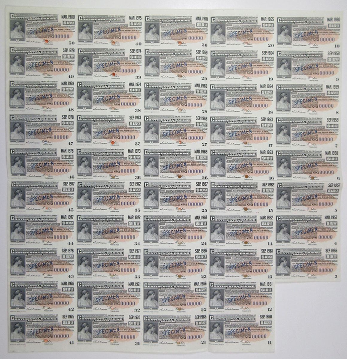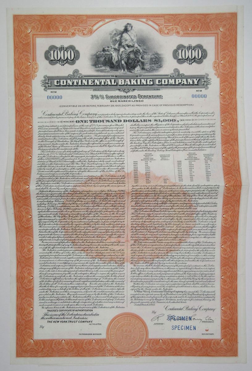 Continental Baking Co., 1955 $1000 Specimen 3 5/8% Coupon Bond, VF ABNC, The Continental Baking Company was one of the first bakeries to introduce fortified bread. It was the maker of the Twinkie and Wonder Bread. Through a series of acquisitions and mergers it became part of the former Hostess Brands company.