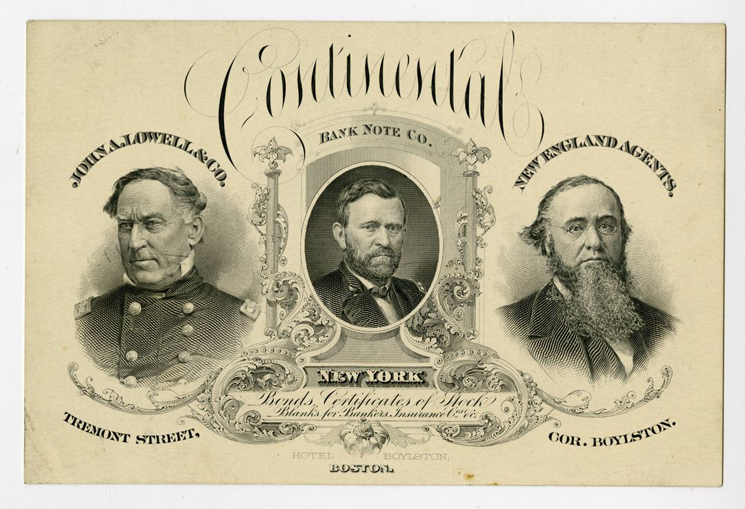 Boston, Massachusetts, ca.1860-70s. Advertising card intaglio printed with large portraits of D.G. Farragut, U.S. Grant, and E.M. Stanton. The advertising card was for John A. Lowell & Co - New England Agents of Continental BNC, located on Tremont Street corner of Boylston. Card is in XF condition with minor fold to the lower left corner. CBNC