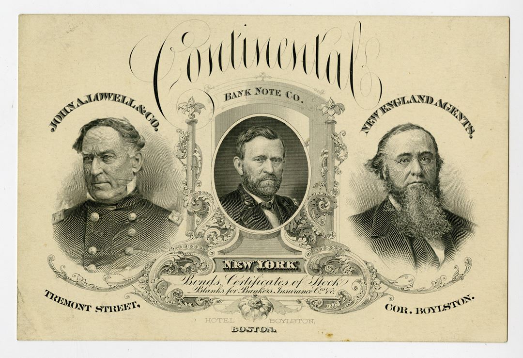 Boston, Massachusetts, ca.1860-80s. Advertising card intaglio printed with large portraits of D.G. Farragut, U.S. Grant, and E.M. Stanton. The advertising card was for John A. Lowell & Co - New England Agents of Continental BNC located on Tremont Street corner of Boylston. Card is in XF condition with minor fold to the lower left corner. CBNC