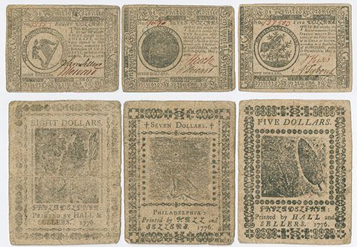 Philadelphia, Pennsylvania. May 9th, 1776. Lot of 3 notes. Includes $5, P-S135, signed by J. Hewes and A. Tybout; $7, P-S137, signed by T. Leech and J. Howard and $8, P-S138, signed by Sam Sellers and J. Howard. All are in Fine to Fine+ condition. Attractive and useful colonial group.