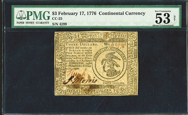 Continental Currency $3 February 17, 1776 CC-25 PMG 53 Net,( Restoration) Serial NBR. 4299