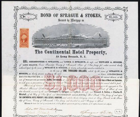 New Jersey, 1866, $1000, Issued and uncancelled bond, Large vignette of hotel on top middle, U.S. 1st Issue adhesive revenue stamp $1 - Lease on upper left, 6 coupons on bottom, signed by Sprague & Stokes., Mitchell and Allen. XF condition with usual storage folds as printed, S/N 71. Scarce New Jersey bond.
