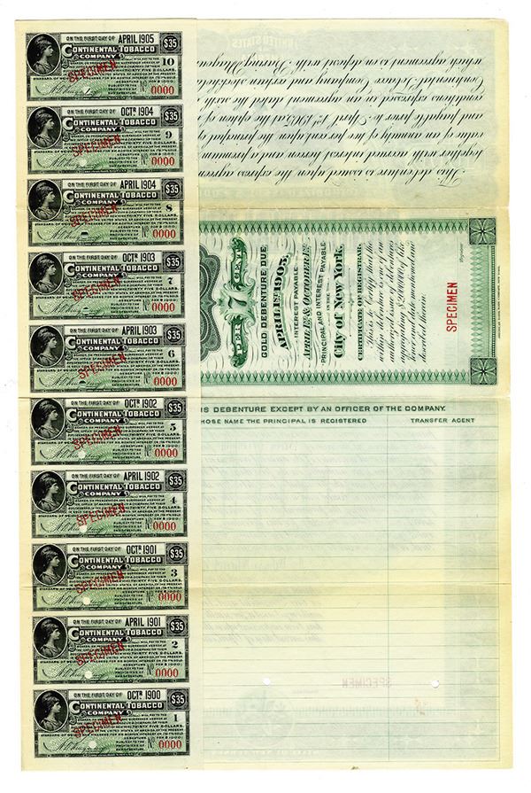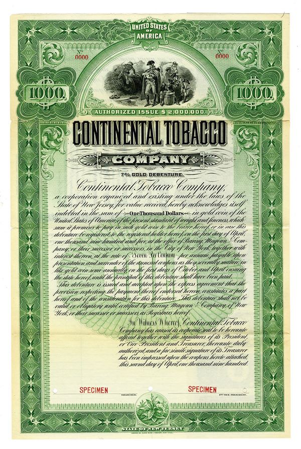 New Jersey. $1000 Specimen 7% Gold Debenture Coupon Bond. Black print with an ornate green border and under tint, in a small sized certificate. Civil War scene at top of certificate. Specimen overprints, POC's, VF-XF condition with coupons attached. ABNC.