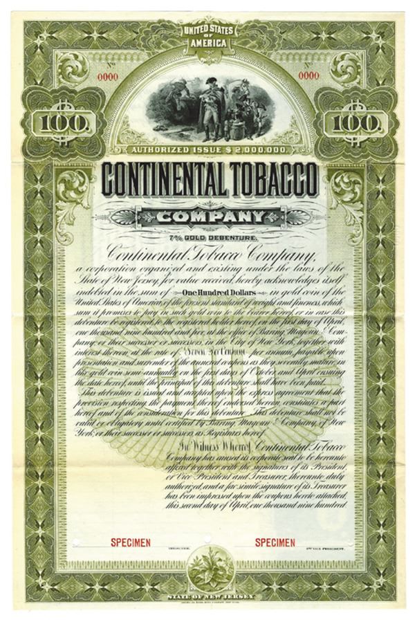 New Jersey. $100 Specimen 7% Gold Debenture Coupon Bond, Black print on green border and under tint, Colonial men at top, Specimen overprints and POC's, VF-XF condition, ABNC. Extremely attractive tobacco bond.