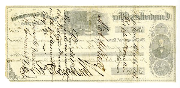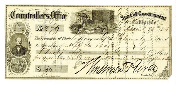 California. 1853, $30, Issued and cancelled warrant, Dog and safe middle, Man at left, Notation of reason for payment "For depositing Marble Block for Washington Monument on board ship. The Washington monument was started in 1848 and work stopped in 1854. It did not resume until 1877. Deserves further research.