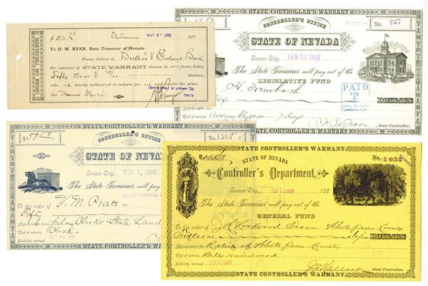 Carson City, Nevada. Lot of 3 warrants, 2 with dog and eagle at left, building at right, for school and legislative funds and 1888 for General Fund with train on left and miners at right. Also delivery receipt for warrants.