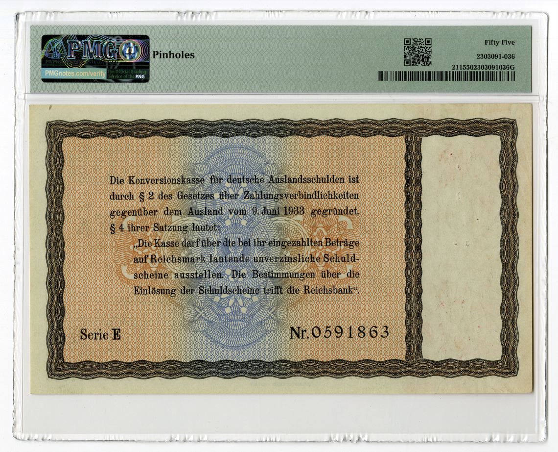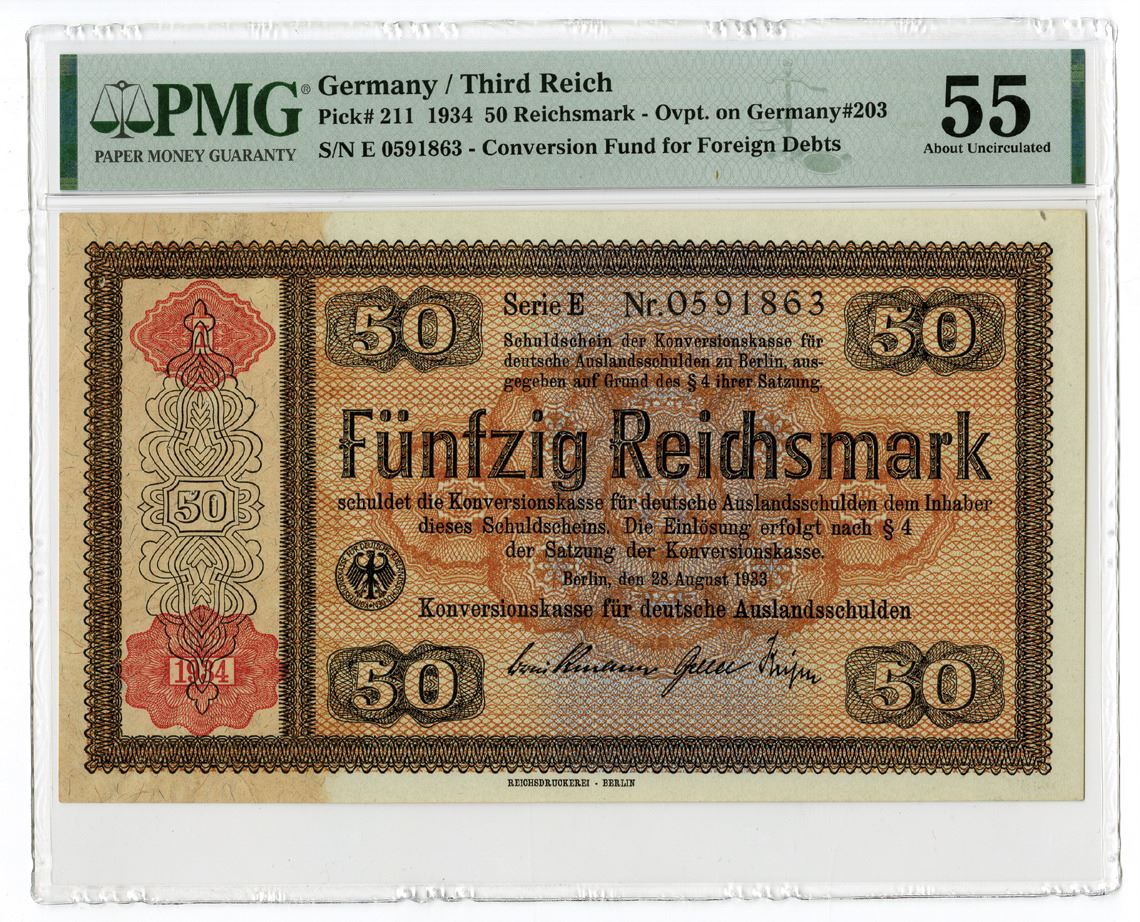 Germany, 1934. 50 Reichsmark, P-211 Overprinted on P-203, Issued Banknote, Black on brown and blue underprint with two red guilloches at left with date "1934", S/N E 0591863, PMG graded About Uncirculated 55 with comment "Pinholes."
