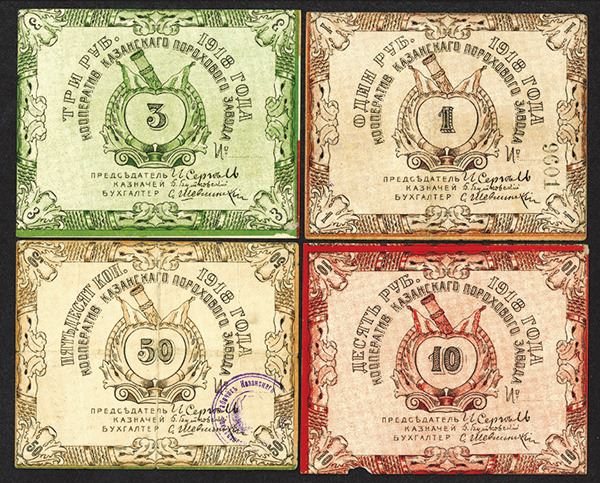 Kazan, Russia. Lot of 4 notes, all from same issuer, Includes 50 Kopeks, VF; 1 Ruble, Choice VF-XF; 3 Rubles, Uncirculated to CU and 10 Rubles, Uncirculated but small chip missing from bottom margin into design, all have flags and what appears to be a cannon over denomination, the 50 Kopeks and 1 Ruble are both issued and the 3 and 10 Ruble notes are remainders. Rare and interesting private issue. (The Pogrebetsky Family Archives)