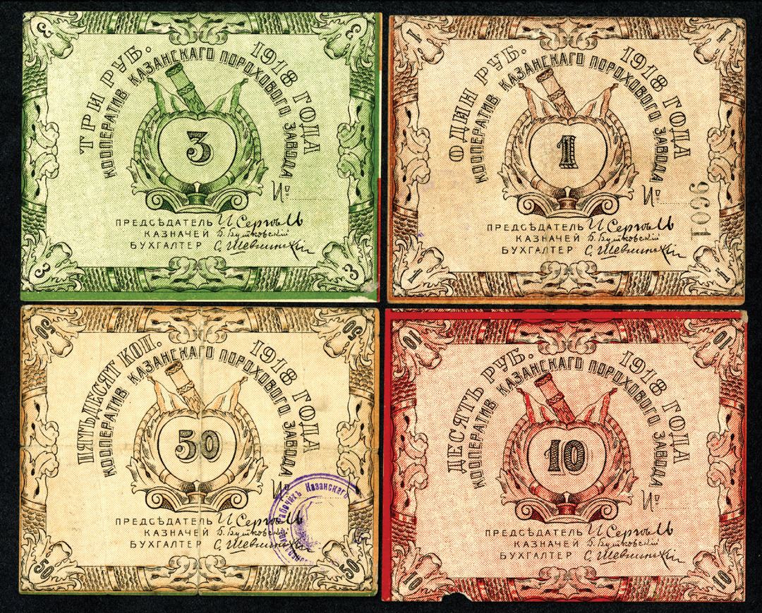 Kazan, Russia. 1918, P-Unlisted, Lot of 4 notes, all from same issuer, Includes 50 Kopeks, VF; 1 Ruble, Choice VF-XF; 3 Rubles, Uncirculated to CU and 10 Rubles, Uncirculated but small chip missing from bottom margin into design, all have flags and what appears to be a cannon over denomination, the 50 Kopeks and 1 Ruble are both issued and the 3 and 10 Ruble notes are remainders. Rare and interesting private issue. (The Pogrebetsky Family Archives)