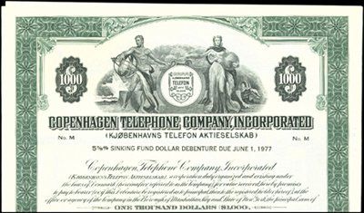 Copenhagen, Denmark, foreign. 1962-1966. 4 different U.S. dollar denominated bond specimens with coupons. All with vignette of allegorical man and woman flanking company logo. 1) $1000, 1962, green. 2) $1000, 1963, orange. 3) $1000, 1964, blue. 4) $1000, 1966, brown. Rare group of Danish telephone bonds. SCBNC. XF.