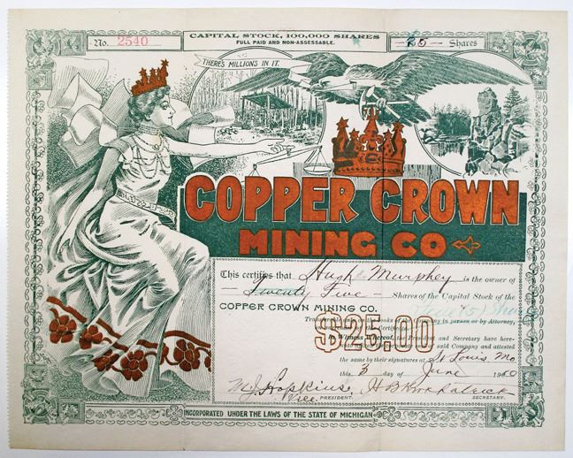 Michigan, 1910. 5 Shares I/U Capital Stock Certificate, S/N 2540, Green and copper colored text with ornate green border, Spectacular and ornate illustration at top and left, featuring a crowned woman reaching towards an eagle, Also features a pair of above-ground mining scenes. VF condition.