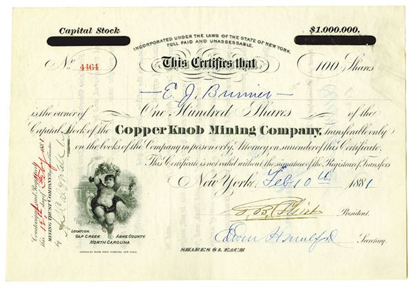 Location: Gap Creek, Ashe County, North Carolina (Inc. in New York), 1881. 100 Shares I/U Capital Stock Certificate, Black text, Allegorical cherub at bottom left corner. XF condition, ABNC.