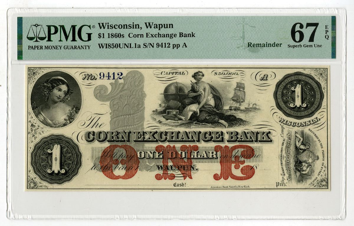 Wapun, Wisconsin, 1860s. $1, WI850UNL1a, Remainder Banknote, Black on red underprint with allegorical woman at top and seal of Wisconsin at bottom right, S/N 9412 pp A, PMG graded Superb Gem Unc 67 EPQ, ABNC.