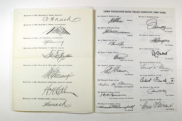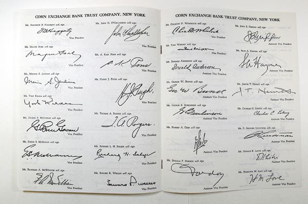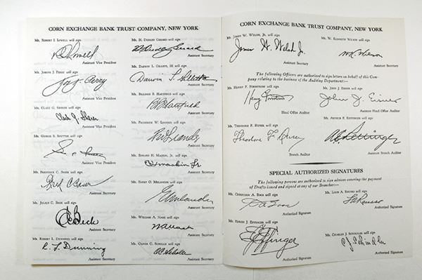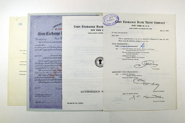 New York. Circular Letter of Credit Specimen ABNC, plus 1952 and 1954 facsimile signature fliers. Also a 1910 signature flier from the Corn Exchange Bank. 4 pieces.