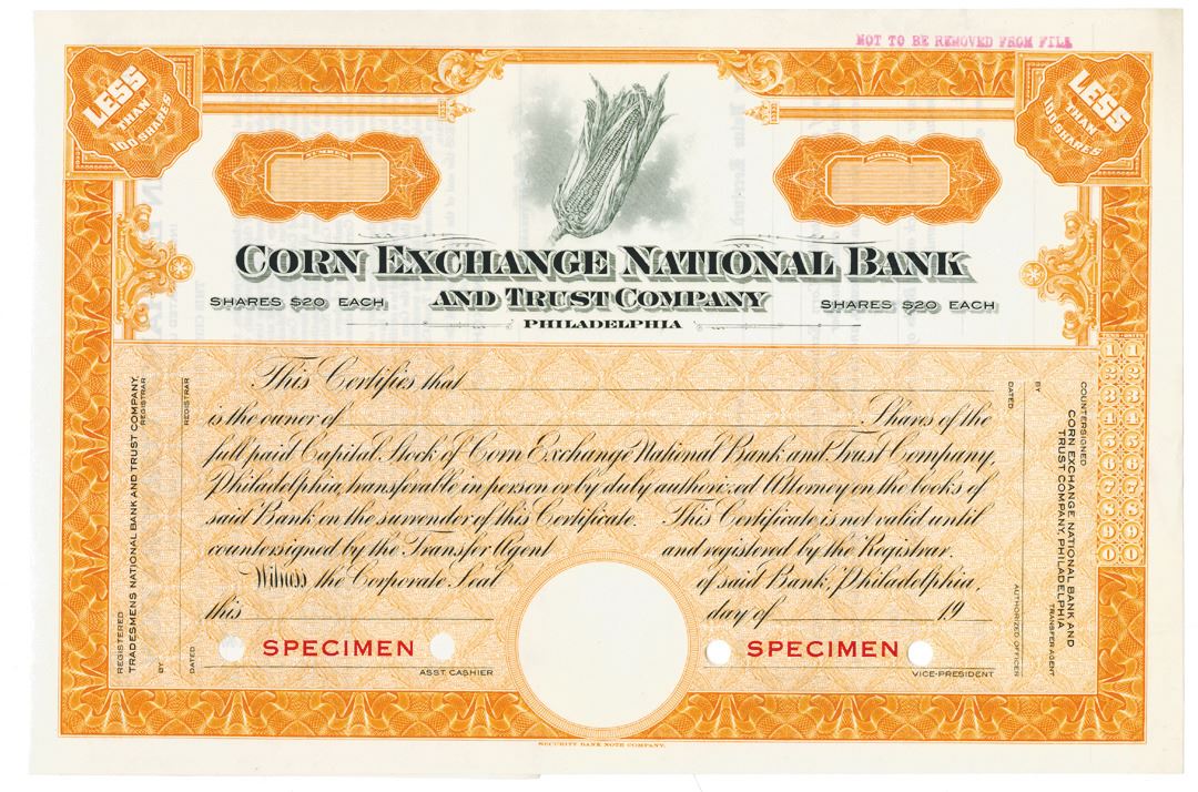 Pennsylvania. <100 Shares Capital Stock Specimen Certificate, Black print on orange border and under tint, Company title at top with ear of corn, Specimen overprints and POC's, VF-XF condition, SBNC.