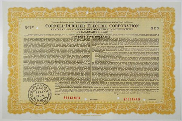 Delaware, 1942. $25 Specimen 4.5% Convertible Sinking Fund Debenture Bond, Black text with yellow border and background. Red specimen overprints, POCs, VF condition, HBN. Cornell-Dubilier Electric Corporation has been manufacturing capacitors for more than a century - 109 years as of this writing to be more precise. That is utterly amazing, especially since they still use the name of the company founder, William Dubilier. In 1933, they merged with Cornell Radio to form Cornell Dubilier Electronics (CDE). If you have been in the electronics field for a while, you no doubt have heard of their capacitors. In fact, William Dubilier was the inventor of mica-based capacitors. According to this obituary in a 1969 issue of Radio-Electronics magazine (he died on July 25, 1969), Mr. Dubilier held 600 patents. I found a newspaper obit that claims Dubilier was offered, but did not accept, a knighthood and pension for life by the British as a reward for inventing a submarine detection device used in World War I by the French and British governments. Mr. Dubilier also invented an electronic flash tube, several radio broadcast systems, and such diverse items as nylon window screens to one of his last developments, in 1966, a sinus-congestion mask.
