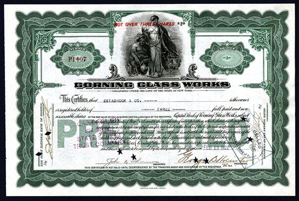 New York. 1922. 3 I/C Stock. #P1407. Black print on green border and underprint. Allegorical figures top center. Pin-punch star cancellations, VF condition. ABNC.