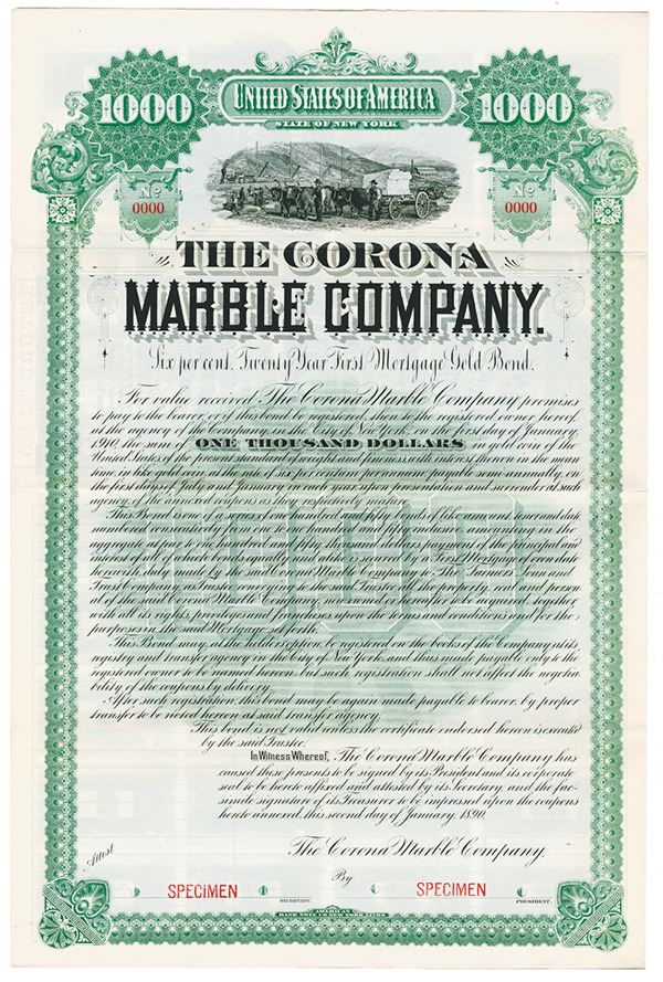 New York. $1,000 Specimen 6% Twenty Year First Mortgage Gold Coupon Bond, Black print on green border and under tint, Wagon at top pulling slabs of marble, Specimen overprints and POC's, VF-XF condition, ABNC.