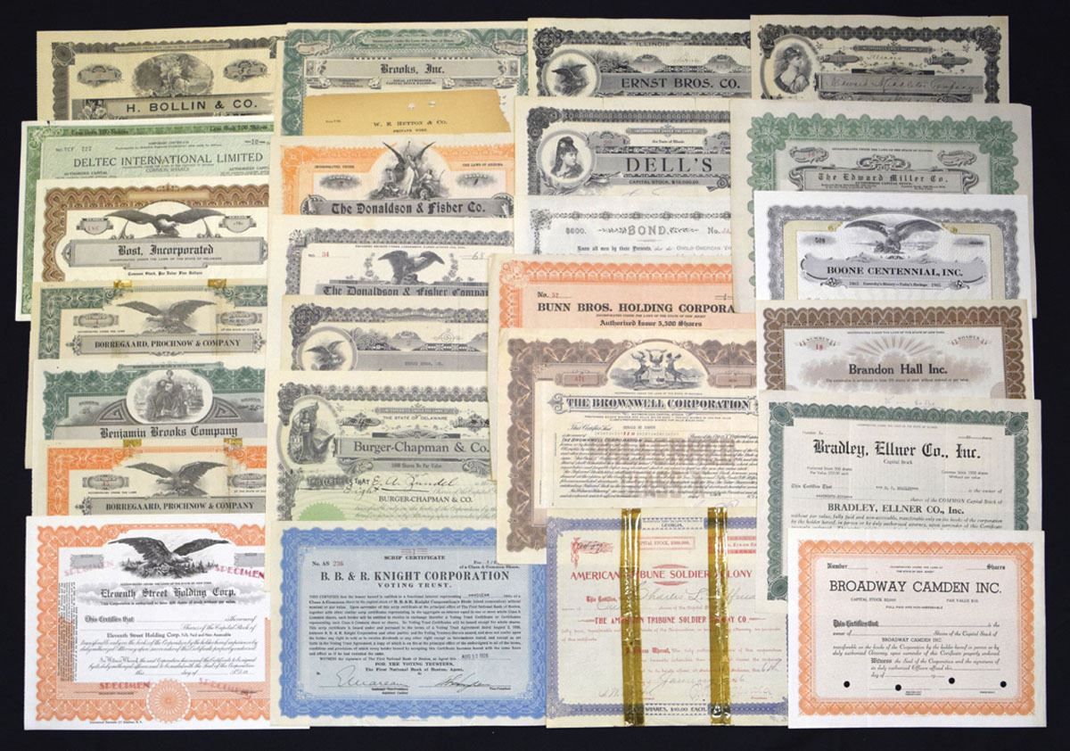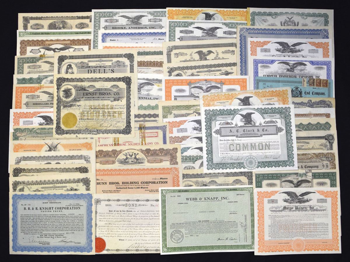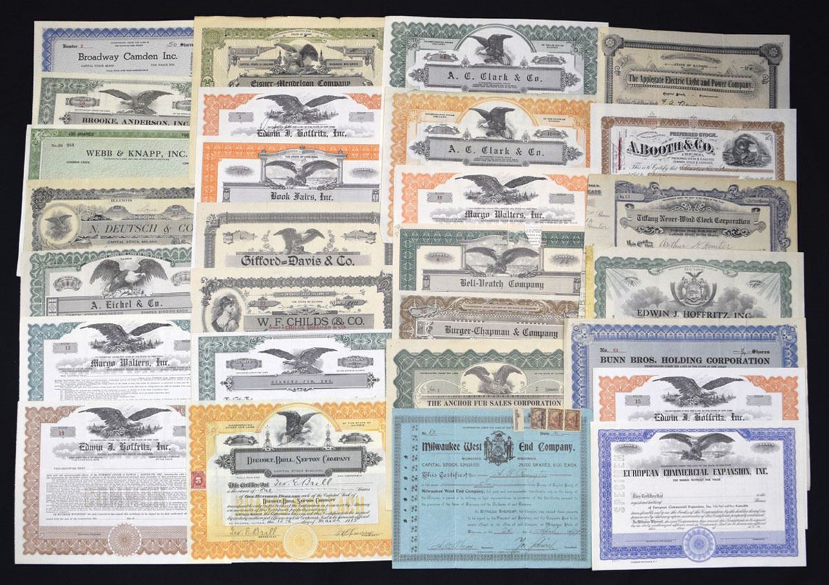 Various States, ca. 1880s-1960s. Lot of 50+ mainly Issued and Uncancelled stock certificates from a variety of American companies spanning diverse industries, including manufacturing, retail, finance, utilities, and specialty enterprises, Includes: Edwin J. Hoffritz, Inc., Benjamin Brooks Co., W. F. Childs & Co., A. Eichel & Co., N. Deutsch & Co., Bunn Bros. Holding Corp., Burger-Chapman & Co., Ernst Bros. Co., Webb & Knapp, Inc., The Donaldson & Fisher Co., Broadway Camden Inc., Brandon Hall Inc., Detroit, Bull, Sefton Co., Brooks Inc., Eisner Mendelson Co., The Edward Miller Co., and others. Several unusual and scarce issues appear, such as early 20th-century holding companies, retail trade firms, and industrial suppliers. Certificates display ornate eagle vignettes, allegorical figures, and decorative borders in multiple colors, adding strong visual appeal. Condition ranges from Fine to Extremely Fine overall, with many well-preserved pieces. A distinctive and varied grouping ideal for collectors of corporate Americana and industrial history. (50+). Sold "AS IS" no returns accepted.