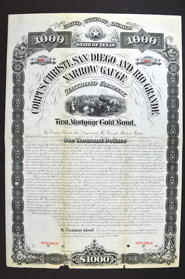 Texas. $1000 7% Gold Coupon Bond. Specimen. POC. ABNC. Paper separation and loss at some folds. Fine+