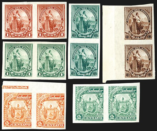 El Salvador, Lot of 6 different imperforate stamp pairs, all printed on india paper, includes two different 1 Centavo, 1895, horizontal pairs in green or orange, Arms of El Salvador; and four different 12 Centavos, 1894 with Standing Liberty, horizontal pairs, green, brown, red and blue, all in XF condition, imperforate. These are not the reprints more commonly seen but original trial color stamps directly from Hamilton Bank Note Company archives. HBNC.