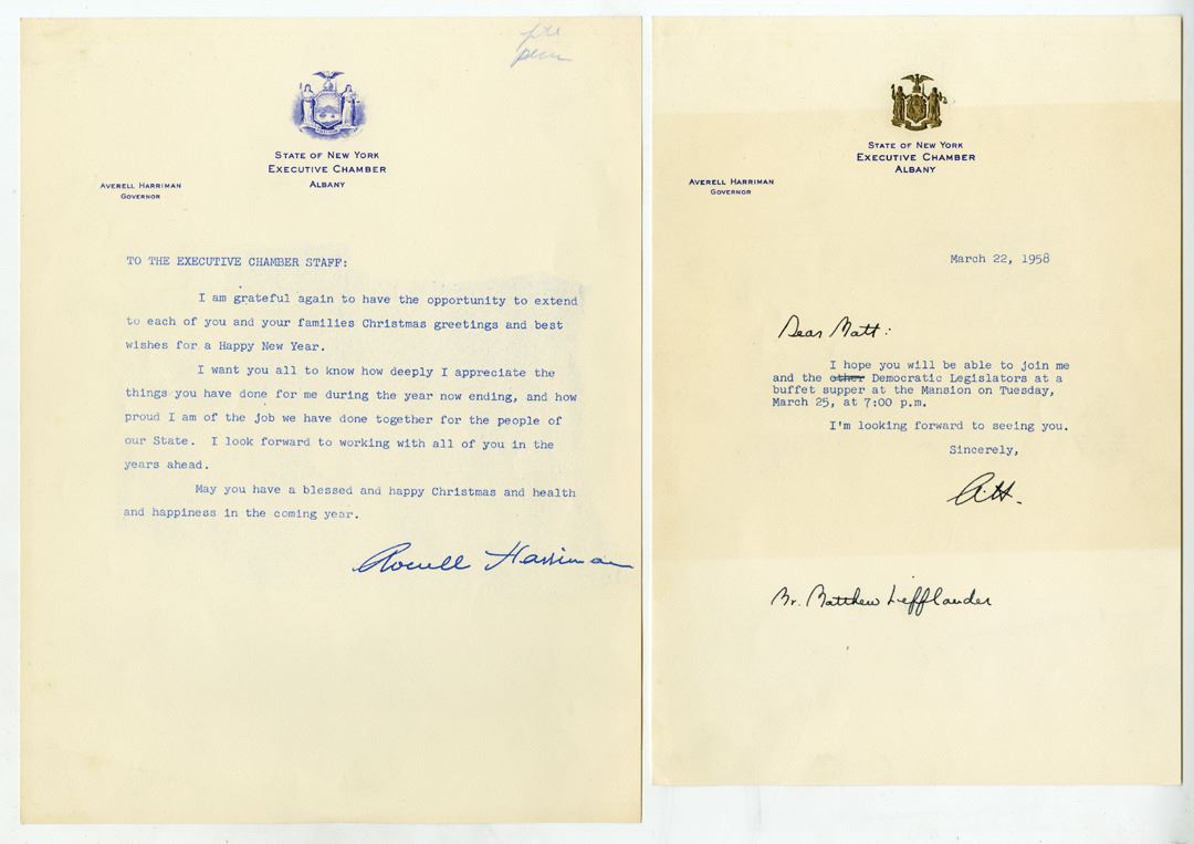 New York....., 1958. Lot of 2 letters with autograph of Averell Harriman on State of New York, Executive Chamber, letterhead. Harriman served as governor of New York for one term before losing to Nelson Rockefeller in 1958. As governor, he increased personal taxes by 11% but his tenure was dominated by his presidential ambitions. Harriman was a candidate for the Democratic Presidential Nomination in 1952, and again in 1956 when he was endorsed by Truman but lost (both times) to Illinois governor Adlai Stevenson.